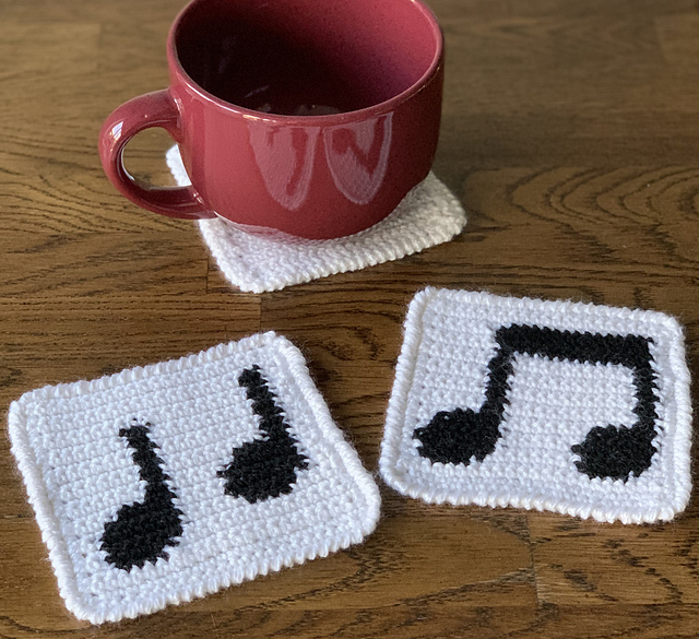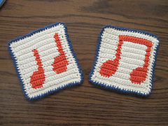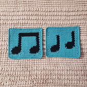 Written instructions as well as a graph are provided for two different musical note coasters. Photo tutorials are included to help with color changing as well as with the border stitch.