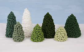 This pattern includes three different styles of **any-height** tree designs - **Standard, Narrow, and Wide** - so you can make tall and short trees in each of the three different shapes. Each tree is worked in one piece, with a simple, easy-to-memorize stitch pattern that results in detailed, realistic-looking foliage.