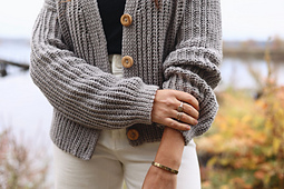 This knit-look cardigan is a wardrobe essential. Although it’s crocheted, the fabric mimics a knit fisherman’s rib, and the silhouette is as classic as it gets. The simplicity of the design is refined with shaped shoulders, symmetric short row shaping at the center front, and a sleek button band to polish it all off.