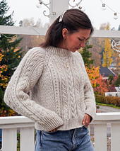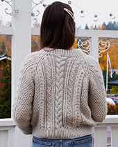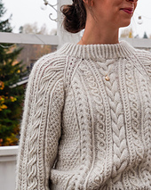 The Arctic Light Sweater is a gorgeous cable knit sweater with intricate patterns on the front, back and sleeves. It's worked top down on 5 mm (US8) needles with one strand of merino together with one strand of silk mohair to give it a lustrous sheen. The length is slightly cropped which makes it the perfect companion to wear with high waisted jeans or a dress.