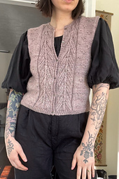 *Cameo* is knitted from the bottom up. The body is knitted in one piece from hem to armholes. Then fronts and back are divided and worked separately. Shoulders are joined together using the 3-Needle Bind-Off Method. Stitches for front bands and collar are picked up and knitted in rib. At the end, armholes are knitted in the round.