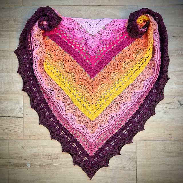 After my previous designs I was wondering which one I liked most… pointy shapes? Round waves? So I had to come up with this shawl, combining the best of both!
