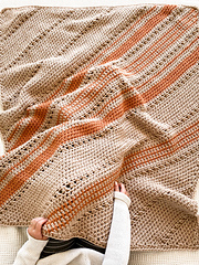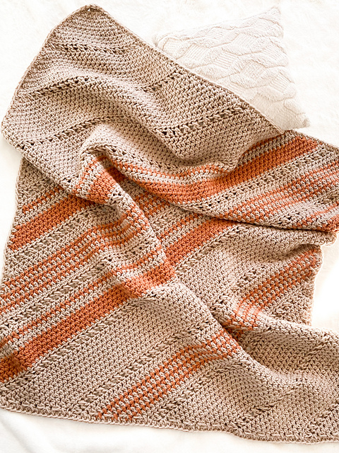 My favorite latte in a blanket! These colors reminded me of my favorite PSL coffee and helped add an extra dose of cozy to it! The relaxing repeat worked on the bias is full of texture whilst having a fun blend of random stripes!