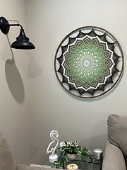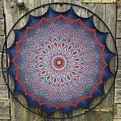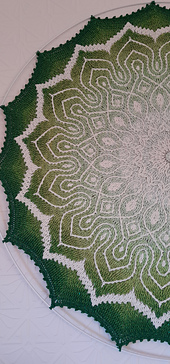 Yarn needed: if you are using yarn similar to Sultan Deluxe Shine, you will need 1000 meters for the background and about 800 meters for the pattern and 2.5 mm hook. The size of my sample is 34", the size of your mandala will depend on your yarn, hook and tension. I recommend having the mandala finished before ordering the hoop. I bought my hoop at eFavormart.com