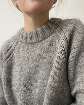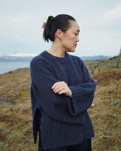 Eun Sweater is a raglan sweater with a high side split that is worked top down. The neckband is knitted in rib and folded in half, and short rows are worked to shape the neckline. The body is worked in stockinette stitch in the round before being divided into front and back pieces, which are worked flat in rib, one at a time. See recommended video tutorials at www.novemberknits.com.