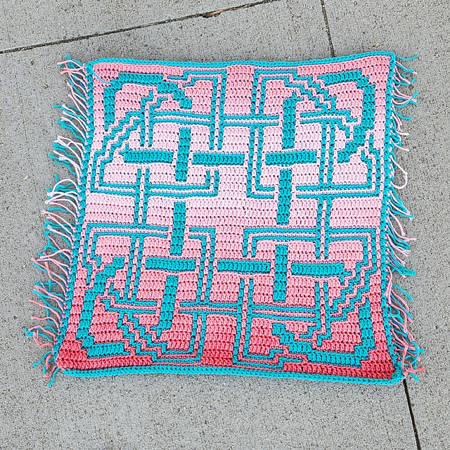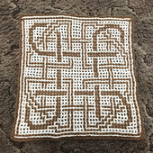 For this series of Celtic knot squares, the interlocking crochet technique uses a chart size of 81 x 81; the mesh dots and extra border lines have been removed for the mosaic version so that chart size is 77 x 77. The interlocking crochet version is done from the bottom-up and there are two overlay mosaic crochet options; one is done from the center-out and the other from the bottom-up.