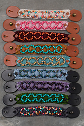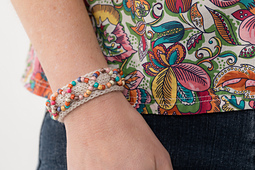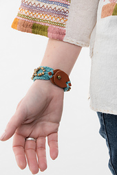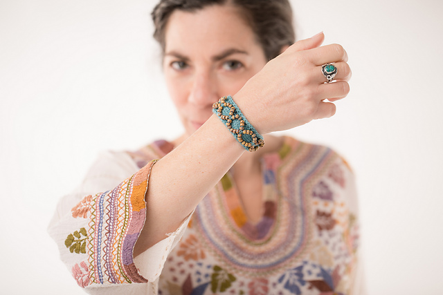 Laxo Cuff is worked from one end to the other flat with a snap clasp finishing it off. The Laxo Stitch features elongated beaded stitches that flow in and out with a cabling technique. The pattern includes a detailed video tutorial that teaches you how to work the cuff!