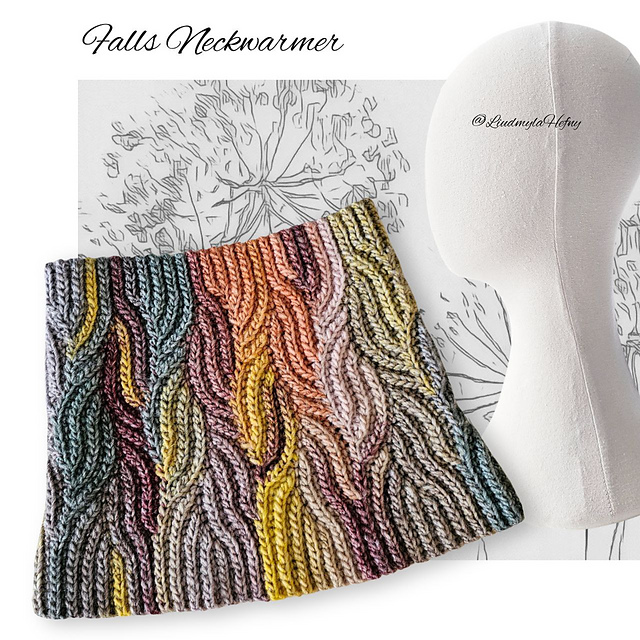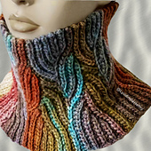 The neck warmer is worked vertically, flat, in one piece. Repeating panels are structured to compose a trapezoid flared neck warmer shape for reliable and beautiful protection from cold and wind, with a super stretchy lower edge to allow a comfortable fit.