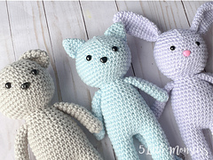 The Long Legged Cat is part of a series of stuffed animals including a bunny and a bear, that are all made in the same style, tall and skinny with long legs. It is about 13" tall. The legs, body and head are worked in one pieces starting with the legs and working up. The ears and arms are sewn on at the end.