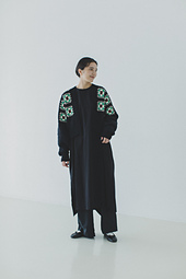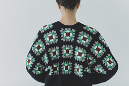 かぎ針で編むクロッシェモチーフをつなげたカーディガンです。カラフルに配色したモチーフは胸上部分に配置し、単色モチーフは袖下と裾に配置することで、モチーフ編み特有の素朴な温かみを感じながらも普段使いしやすいデザインに落とし込みました。たくさんのモチーフをつなげるのは根気のいる作業ですが、半目の巻きかがりでつなぐことで美しく仕立てることができます。モチーフを全てつなげ終えたらカーディガンとして実用的に着やすいように、袖口と裾、前立てを棒針で拾いゴム編みで仕立てます。