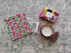The FeatherBurst dishcloth uses a combination of double crochet clusters and V-stitches to create a motif reminiscent of grandly displayed feathers or splashing bursts of water. A four row repeat makes this a great project that doesn't take too much concentration but is still interesting.