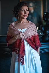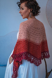 This crescent shaped shawl is designed for three gradients of Amal Fingering. The bits of linen in the yarn provide a little extra texture and give the shawl a slightly rustic look. The strongest color should be used in the border, as it is what will be most prominent when wearing the shawl.