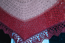 Four different stitch patterns are used in the body of the shawl. Each stitch pattern includes shell stitches, which ties the designs together. By stacking the shell stitch combinations in three areas of the shawl, an angular edge is produced. The stitch patterns also gradually progress from a fairly dense fabric to a slightly open lace design. The shawl is finished with an easily worked border design that creates a pretty, scalloped edge.