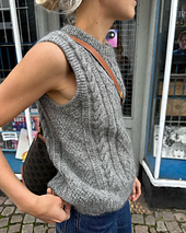 The Moby Slipover is worked from the top down in a texture and cable pattern. First the back yoke is worked. After this, stitches are picked up and knitted for the shoulders, which are then joined to form the front yoke. The front and back yoke are joined to form the body, which is worked straight down in the round. Rib edges are worked along the neck edge and armholes. Knit a swatch to determine which needle size you need to achieve the correct gauge – note that this can vary from yarn to yarn. Take care to wash the swatch before measuring, as the texture pattern can grow with wash.