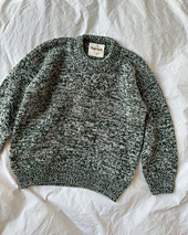Melange Sweater Junior is worked from the top down. First, the back yoke is worked back and forth in stockinette stitch. Then, each shoulder is worked separately and joined to form the front yoke. Front and back yoke are then joined to form the body, which is worked in the round on a circular needle. Stitches for the sleeves are picked up and knitted along the armholes, worked in the round on double-pointed needles or on a circular needle using the Magic Loop technique. Finally, the rib edge at the neckline is worked from picked-up stitches and folded double. Melange Sweater Junior is worked in two strands of yarn in contrasting colors to achieve the marled or “mélange” color.
