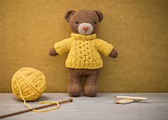 enquanto tricota o corpo e as pernas. Em seguida, retomamos as malhas dos braços e tricotamos em circular até fechar a mão. O focinho e as orelhas são tricotados separadamente e depois cosidos ao corpo do urso. O nariz é bordado sobre o focinho. No final, tricotamos a camisola também de cima para baixo, sem costuras e com o painel de torcidos “colmeia” na frente.