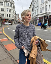 The Melange Sweater is worked from the top down. First, the back yoke is worked back and forth in stockinette stitch, while the slope of the shoulders is created using short rows. At the bottom of the back yoke, increases are worked to shape the armholes. After this, each shoulder is worked back and forth separately towards the front on circular needles, and then the two shoulders are joined to form the front yoke. Back and front yokes are joined at the bottom of the armholes to form the body, which is worked in the round on the circular needles. The sleeves are worked from stitches that are picked up and knitted along the armholes. The sleeves are worked in the round on circular needles or on double-pointed needles or using the Magic Loop technique. At the end, a neck rib edge is worked from stitches that are picked up and knitted around the neck opening. The neck rib edge is then folded double and knitted together. The Melange Sweater is worked in two thin strands of wool yarn in contrasting colors held together to achieve the marled or “mélange” look. Start by knitting a swatch to determine which size needle gives you the correct gauge.