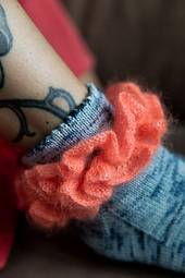 These short, ankle-skimming socks feature a picot edge and ruffles. They are worked from the top down with a Stockinette Stitch heel flap and gusset. The ruffle is picked up as you go in contrasting silk mohair and knitted in the round on larger needles.