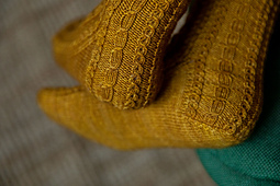 The *Aurora* socks feature an easy-to-memorise cable pattern that travels all around the sock — including the heel.