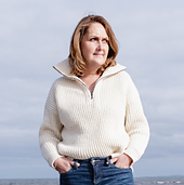The Lanark Sweater is an oversized, drop-shoulder sweater, knit in Half Fisherman's Rib and finished with a sewn-in zipper. The sweater is worked top-down, first flat and then in the round.