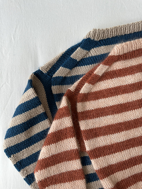 Dk weight yarn or 1 strand of fingering held with 1 strand of lace weight. Jeffreys sample uses Along Avec Anna Double Merino in Royal and Dune, Penelope’s sample uses Along Avec Anna Merino held with Silk Mohair in Tomette and Tourmaline (amounts are for each strand)