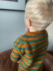 This garment has 7.5 - 15cm / 3-6” positive ease worked into the grading. This means if you go up or down a size to adjust the ease, your yoke/sleeves may end up too big or small. If choosing a different size than recommended for the age of the child, you may want to follow the lengths of the recommended size. Always measure your child as ages are only a recommendation. Penelope’s sample is size 5-6 with the body length of size 3-4. Penelope has a chest circ of 58.5cm / 23” and is 3.5 years old so the sample has 15cm / 6” positive ease, with an appropriate length for her age. When in doubt its always best to size up. Children vary greatly in height so try your garment on regularly, adding length where appropriate as described in the pattern.