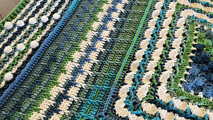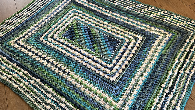 When they collaborate, they have the same tension in their hands. So Mikey started this with a 6 dc cluster corner-to-corner rectangle shape. Jeanne took over the blanket and did the textured shells and so on.