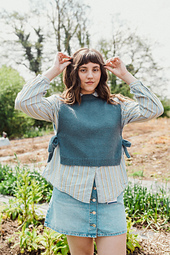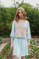 **Primrose (Slipover)** est un pull sans manche, en jersey, qui est tricoté avec un fil de Merino (Fingering) et un fil de Silk Mohair (lace). Il s'agit d'un petit pull parfait à porter sur une jolie blouse, chemise ou robe et qui se porte avec une aisance entre 5 et 10 cm. Sa particularité est qu'il est constitué d'un panneau sur le devant, et un autre sur le dos, qui se ferment sous les bras par des jolis noeuds tricotés en jersey double.
