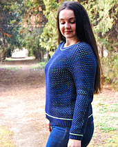 My sample uses Alize Cotton Gold in color 58 Navy as MC, and Cotton Gold Batik in color 4146 as CC (WPI=13). I’m wearing the top in size 3, showing 1" of positive ease around the bust for a comfortable but close-fitting sweater. Pick a size with more positive ease for the ultimate snuggly, squishy jumper, or go for a bit of negative ease for a sexy blouse that hugs your curves!