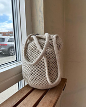 The white Breeze Bag is knitted in Trio 2 by Isager in the color Linen held together with Merilin by Isager in color 0.