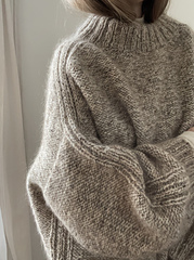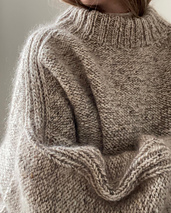 Bawi is the ultimate oversized sweater in a lovely thick aran tweed yarn, making it the perfect transitional sweater. Use it as you would a jacket over other knitwear or as a perfect statement piece in your wardrobe. The sweater is worked top-down, with increases along the shoulder, and the front and back pieces are worked along the sleeve hole one at a time. The sweater is worked inside out to avoid working in mostly purl stitches.