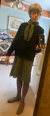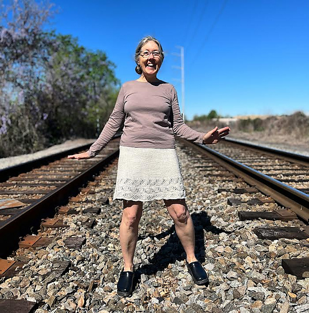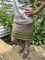 The skirt is knit in one piece from the lace edged bottom up with no designated front or back,