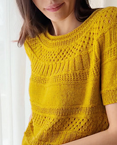 **knus light** is a round yoke blouse with short sleeves. The short blouse is worked in a textured pattern from the top down with the option of working the lower body in stockinette stitch or the whole blouse in the textured pattern.