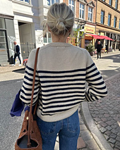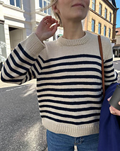 The Lyon Sweater is worked from the top down. First the top part of the back yoke is worked with increases, then the shoulders are worked from stitches that are picked up and knitted along the slanting sides at the back yoke. Stitches are then picked up and knitted along the sides of the shoulders and the rest of the yoke is worked together on the circular needle, first back and forth and then in the round. The body is worked in the round on a circular needle, and the sleeves are worked in the round on double-pointed needles or on a circular needle using the Magic Loop technique. At the end a folded neck edge with built in double knitting is worked. The Lyon Sweater is worked with stripes, the placements of which are described in the pattern.