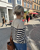**Suggestion 2:** 200 (200) 200 (200-250) 250 (300) 300 (350) 350 g Sunday by Sandnes Garn (50 g = 235 m \[257 yds\]) **held together with** 100 (100) 100-125 (125) 150 (150) 175 (200) 200 g Tynn Silk Mohair by Sandnes Garn (25 g = 212 m \[232 yds\]) for the main color of the sweater **and** 100 (100) 100 (100-150) 150 (150) 200 (200) 200 g Sunday by Sandnes Garn (50 g = 235 m \[257 yds\]) held together with 50 (50) 50-75 (75) 75 (100) 100 (125) 125 g Tynn Silk Mohair by Sandnes Garn (25 g = 212 m \[232 yds\]) for the stripes.