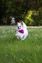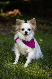 To style this bandana, wrap it around your dogs neck like a collar. Thread the strap through the chain-5 loop, then tie the strap into a simple knot around the loop.