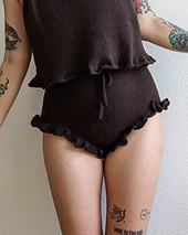 High waisted cashmere bloomers, inspired by babies, designed for adults. Elastic waistband and drawstring closure. Ruffle details at both leg openings. The perfect pair of underwear for comfortable lounging.