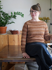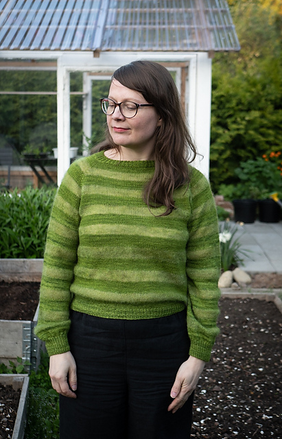 The Tyyne Pullover is a wonderfully light and airy sweater that warms you comfortably even in colder weather. The sweater is worked seamlessly top down and has raglan inserts. The surface of the shirt is formed by stripes knitted from fingering and lace weight yarn.