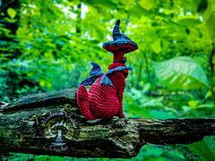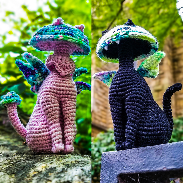 "Kitty Cap Mushroom Fae" is a choose-your-own-adventure pattern that has 4 different wing styles including fairy, butterfly, and bat wings, 3 freely styleable tail options, 2 mushroom caps with variations, along with a fluffy kitty mane/mushroom skirt, fangs, and ear options.