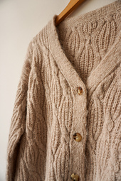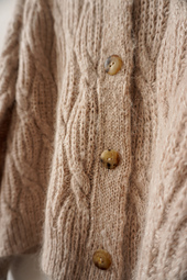 The Minou Cardigan is a cozy, yet elegant cardigan with beautifully alternating Half Fisherman's Rib and cable stitch. It will be worked top-down without sewing, starting with the back and from there proceeding with the two fronts. Below the arms all three parts will be combined and worked until the desired length is achieved. A 1x1 rib will be added to give a nice finishing touch. Both drop-shoulder sleeves will be worked by picking up stitches from the body and knitted without decreases until the desired length, then again a 1x1 rib will be worked as finishing step. A double knitted button band gives the whole cardigan an elegant edge and can be individually styled with four buttons.