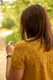 The Pampas Tee is knit seamlessly from the top down. The neckline is cast on and short rows are worked to raise the back of the neck for a comfortable fit. The yoke lace is knit, then the body and sleeves are separated and worked from the top down.