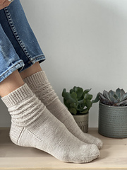 Sandown Socks are knit in the round from the cuff down using the magic loop method. They feature a stretchy cuff knit in 1 x 1 ribbing, accent stripes along the leg created with purl stitches, and textured ripples formed with simple cable stitches. The heel is constructed using the ‘Eye of the Partridge’ heel flap which adds a nice texture and strength to the heel, and toes are finished using gradual decreases. The length of the leg is adjustable and can be made longer by repeating the pattern sequence. The pattern is ideal for semi-solid or lightly speckled yarns that will show off the textured pattern of the socks.