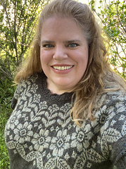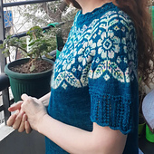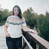 Alpine Bloom is a light summer tee knit from the top down featuring a sweet lace neckline and sleeves and a Scandinavian-inspired floral colorwork yoke. Short rows are worked at the back neck for an improved fit. The sleeves are knitted separately and grafted on. Instructions are given for lengthening the body as desired and for simple ribbed sleeve cuffs if you'd prefer not to graft the sleeves on.
