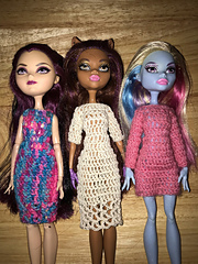 I designed this a long time ago, when I was much less patient with this art form. It's extremely simple, and quick to work up, with no sewing required! Also, it fits both classic Monster High and Ever After High dolls, with no adjustment required!