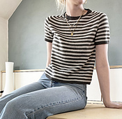 The Tombo Tee is my take on the perfect everyday striped t-shirt. It is knitted from the top down, flat at first to shape the neckline, and then in the round. It uses a saddle shoulder construction which later transitions into raglan increases. The design carefully considers the placement of the stripes to ensure a neat look.