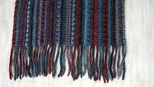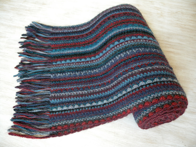 This pattern is created for autumn/winter scarf to use with alpaca and wool yarns, a bit hairy textured and loose-twisted.