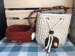 **Bag mechanics and size**: The cylinder bag cinches closed with a drawstring, and the top cap moves up and down on the bag straps. Once complete the bag is about 6 inches wide and 8 inches tall, depending on yarn type and crocheter tension.