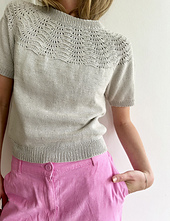 The lace pattern on the yoke is both addictive and simple to knit. The combination of lace with purl stitches is beautiful. Peacock shirt is worked top-down. It has a short, but loose fit.