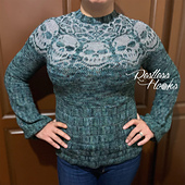 This is an intermediate difficulty pattern. The yoke uses Fair Isle colorwork technique, and the rest includes ribbing, different placement of stitches, linked stitches, as well as shaping with decreases and increases.