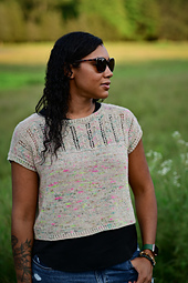 Wild Flowers is a fingering weight tee, intended to be worn with a relaxed fit of 5–7” / 12.5–17.5 cm positive ease. This design features Garter Stitch shoulder shaping and a delicate lace pattern along the front upper yoke only (the back is worked in Stockinette Stitch) and is finished with a simple Twisted Rib hem.
